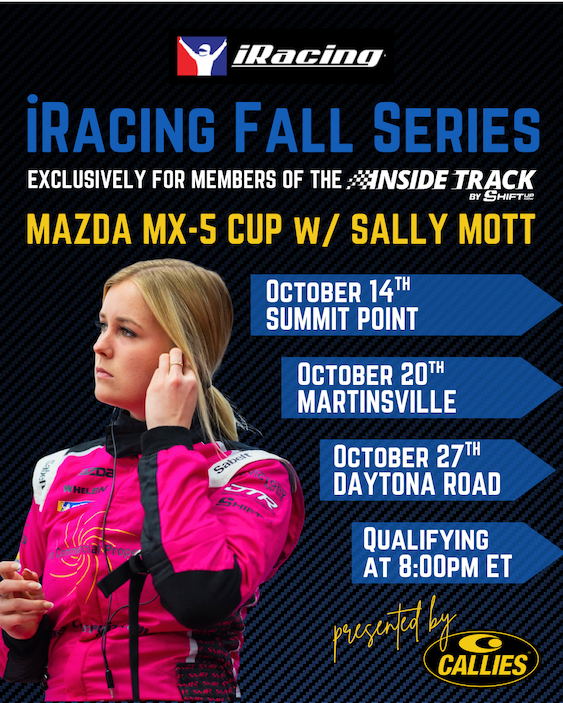 After all the fun we've had with the iRacing Spring Sprints and Summer Series, we're bringing it back to the track with the Fall Series, featuring Shift Up Now Athlete Sally Mott in Mazda MX-5 Cup, and presented by Callies!